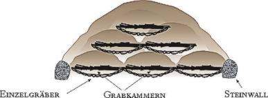 Die Grabstätten lagen alle in Sichtweite zu den Siedlungen und die Menschen ernährten sich von der Viehhaltung. An den Grabstätten läßt sich ableiten wie lange eine Gegend bewirtschaftet werden konnte. Ab etwa 1000 Jahre v. Chr. begann die Brandbestattung. Die Asche wurde zusammen mit Grabbeigaben in Urnen (Tongefäßen) gefüllt und beigesetzt. |